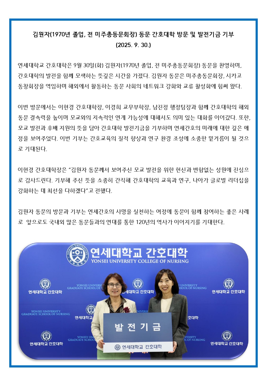News 김원자(1970년 졸업, 전 미주총동문회장) 동문 간호대학 방문 및 발전기금 기부 [2025.09.30] 관리자 2025-10-01 조회수 69 공유하기 공유하기 페이스북 네이버블로그 카카오톡 카카오스토리 닫기 목록 이전글연세대학교 간호대학, 메풀 전산초 명예교수 기념 학술대회 개최 "차세대 간호과학자 양성: 혁신적 연구·교육·정책” 주제로 미래 발전 방향 모색" 다음글다음글이 없습니다.
