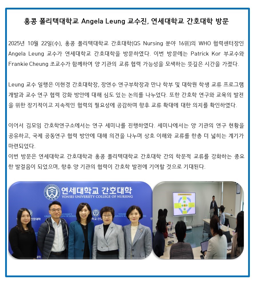 News 홍콩 폴리텍대학교 Angela Leung 교수진, 연세대학교 간호대학 방문 관리자 2025-10-23 조회수 226 공유하기 공유하기 페이스북 네이버블로그 카카오톡 카카오스토리 닫기 목록 이전글연세대학교 김모임간호학연구소, '2025 연세건강이음' 노인돌봄생활지원사 역량 강화 교육 성료 다음글2025년도 World's Top 2% Scientists 선정